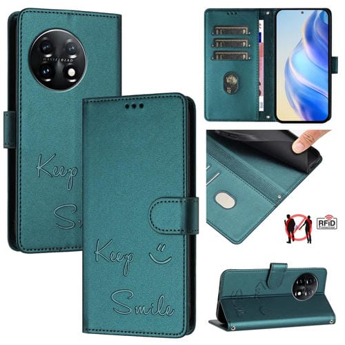 Funda de Cuero Rfid con Relieve Sonriente para OnePlus 11 (Verde Pavo Real)