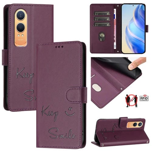 Funda de Cuero Rfid con Relieve Sonriente para OnePlus Nord Ce4 Lite (Violeta)