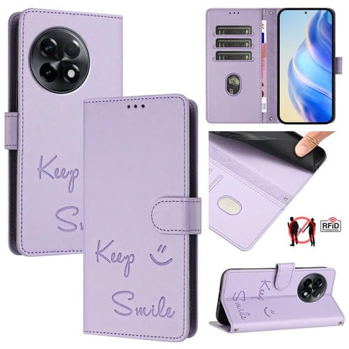 Funda de Cuero Rfid para OnePlus 11R 5G con Relieve de Sonrisa Global (Morado Claro)
