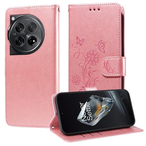Funda de Cuero con Diseño de Mariposas y Flores en Relieve para OnePlus 12 (Oro Rosa)