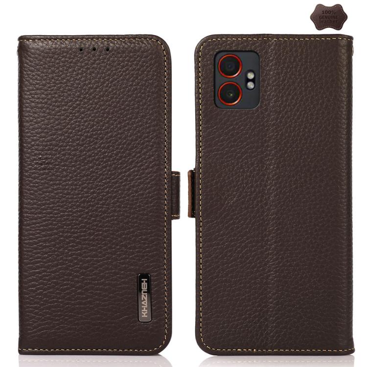 Funda de cuero genuino KHAZNEH con imán lateral y RFID para Samsung Galaxy XCover7 Pro (marrón)