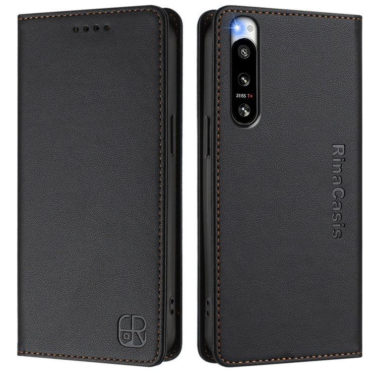 Funda de Cuero para Sony Xperia 5 IV RC01 con Doble Pliegue y Succión Magnética RFID (Negra)