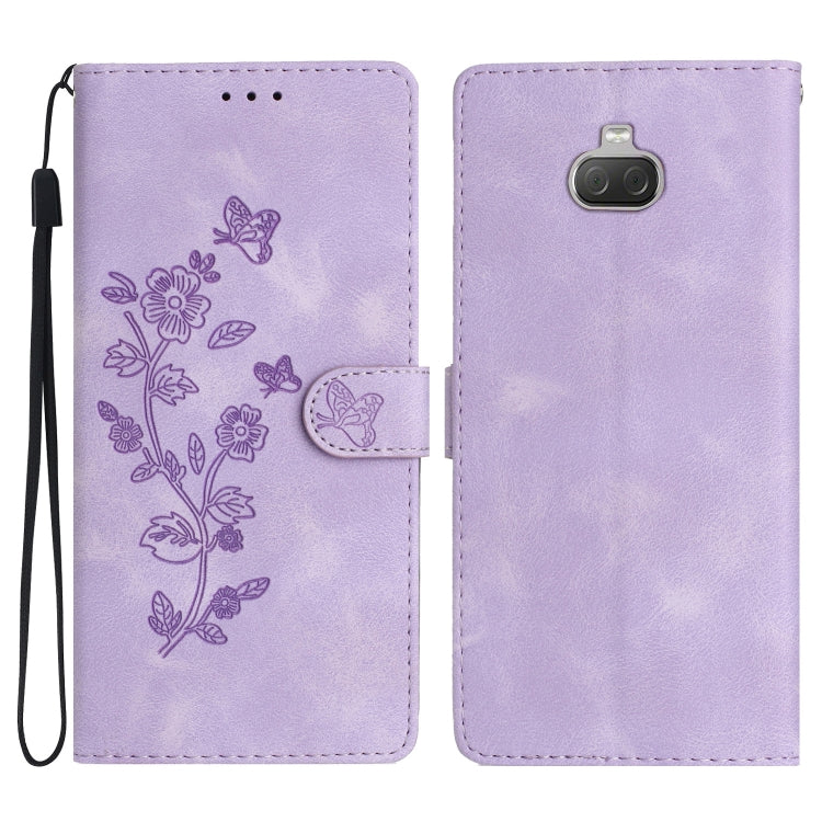 Funda de Cuero para Sony Xperia 10 con Relieve Flor y Mariposa (Púrpura)