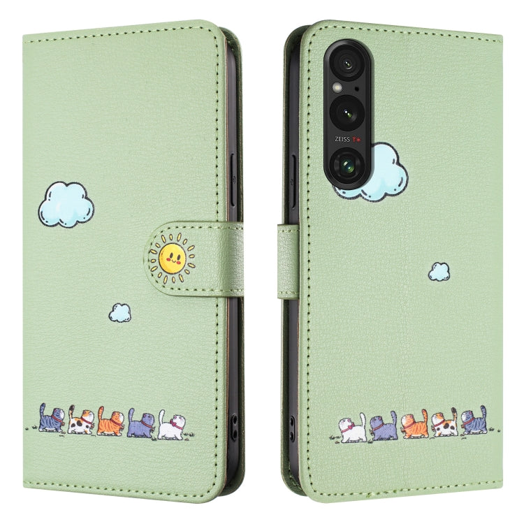 Funda de Cuero para Sony Xperia 1 V con Gatos de Dibujos Animados (Verde)
