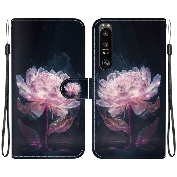 Funda de Cuero para Sony Xperia 1 IV con Dibujo Coloreado y Textura de Cristal (Peonía Púrpura)