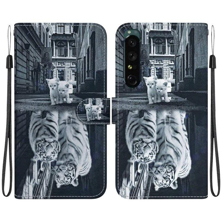 Funda de Cuero para Sony Xperia 1 IV con Dibujo Coloreado y Textura de Cristal (Reflejo de Tigre Gato)