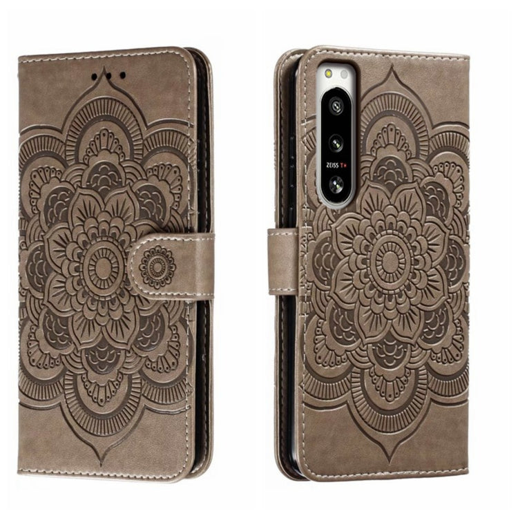Funda de Cuero Sony Xperia 5 IV con Patrón Sun Mandala en Relieve (Gris)
