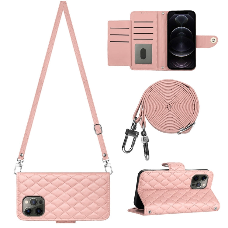 Funda para Teléfono iPhone 12 Pro Max con Tapa de Cuero Textura Rómbica y Cordón Largo (Rosa)