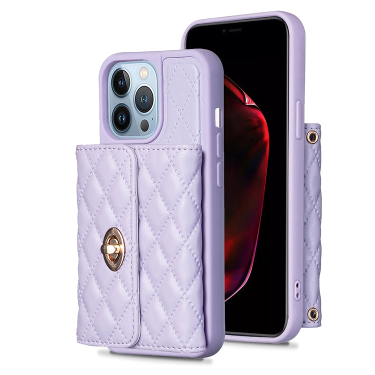 Caja de Teléfono Cuero Rómbica para iPhone 13 Pro con Hebilla de Metal Horizontal (Púrpura Oscuro)