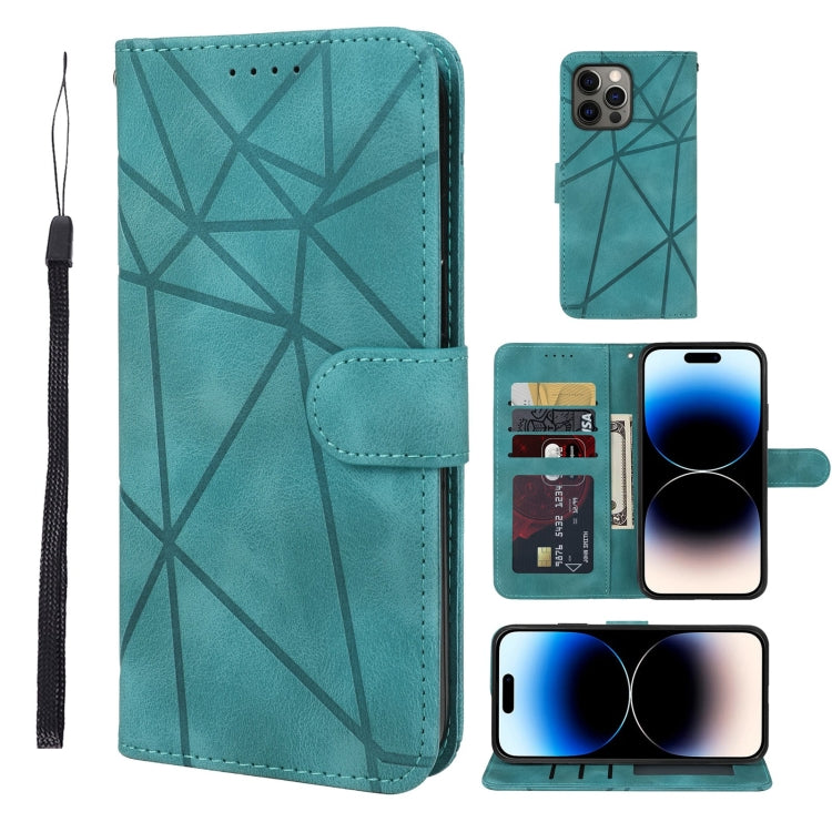 Funda para teléfono iPhone 14 Pro Skin Feel de cuero con líneas geométricas (Azul)