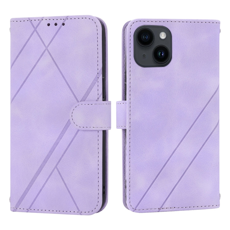 Funda de Cuero para iPhone 15 Plus con Línea en Relieve y Cordón (Púrpura)
