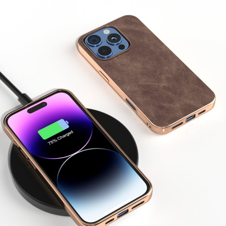Funda para Teléfono iPhone 16 Plus Marco Galvanizado Cuero Sintético Cobertura Total (Café)