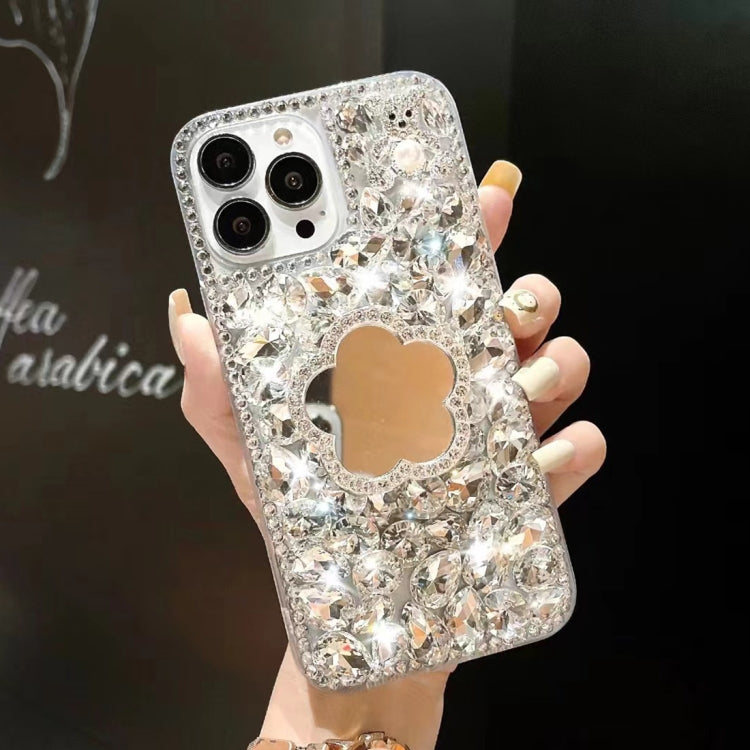 Estuche para Teléfono PC con Diamantes de Imitación y Espejo para iPhone 16 Pro (Flor Gris Plateada)