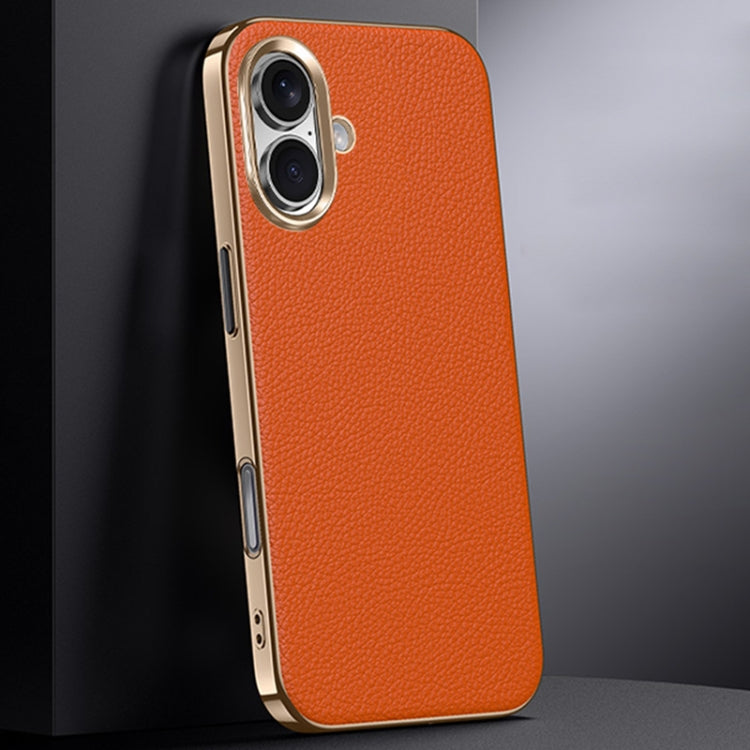 Funda para Teléfono iPhone 16 Marco Galvanizado Cuero Sintético Cobertura Total (Naranja)