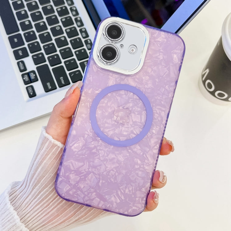Funda de Teléfono TPU Magsafe iPhone 16 Textura Enchapada Película Lente Brillo (Hilo de Plumas Morado)