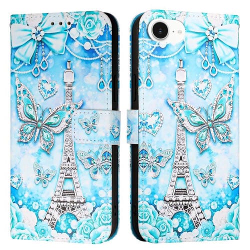 Funda de Cuero para iPhone 16E con Patrón de Dibujo de Colores Mariposa en Forma de Torre