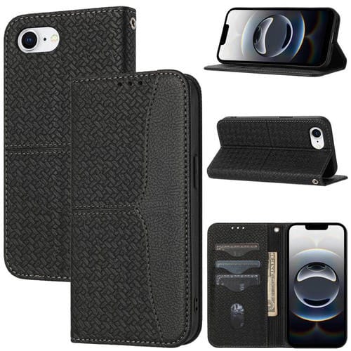 Funda de Cuero Magnética para iPhone 16E con Costuras y Textura Tejida (Negra)