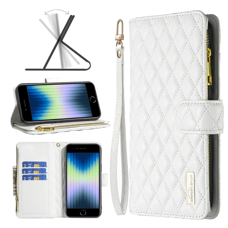 Funda para iPhone SE 2022 SE 2020 8 7 Patrón Rómbico Microfibra Cuero TPU con Cadena Cruzada (Blanco)