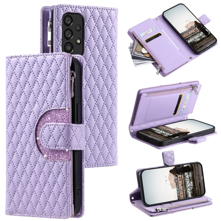 Estuche de Cuero Samsung Galaxy A53 5G con Billetera, Cremallera y Celosía con Purpurina (Púrpura)