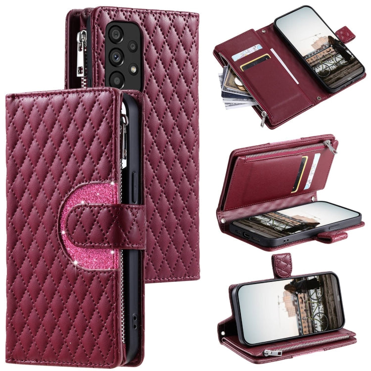 Estuche de Cuero Samsung Galaxy A53 5G con Billetera, Cremallera y Celosía con Purpurina (Rojo Vino)