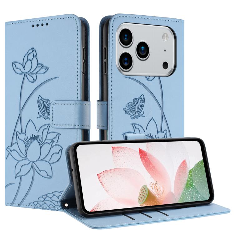 Funda de cuero con relieve de loto para iPhone 17 Pro Max con cordón (azul)