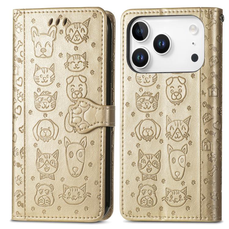 Funda de piel con estampado de gato y perro para iPhone 17 Pro Max (dorada)