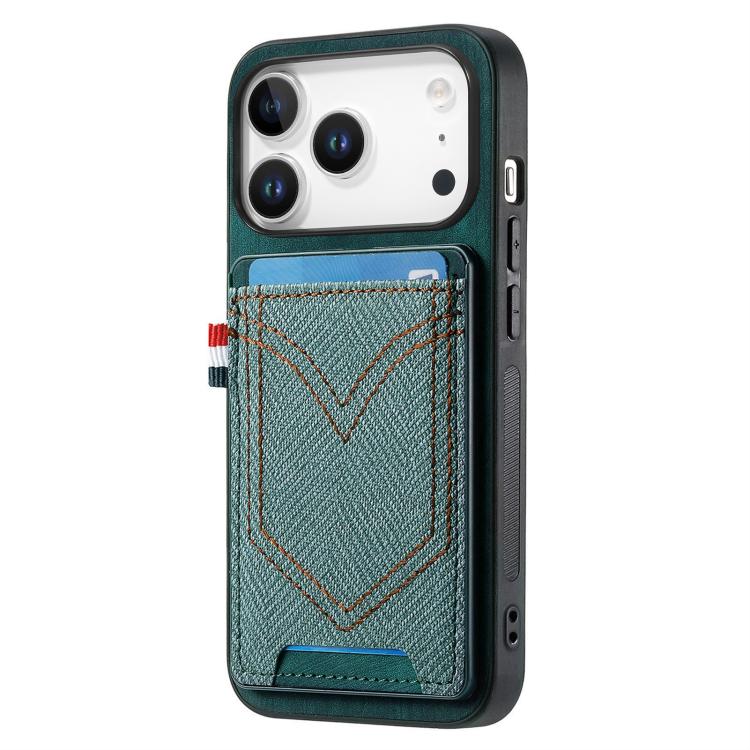 Funda de piel con textura vaquera para iPhone 17 Pro Max con ranura para tarjetas (verde)