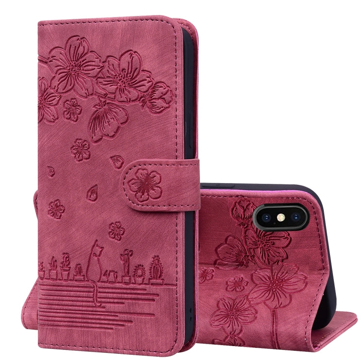 Estuche de Cuero para iPhone Xs Max Cartoon Sakura Cat En Relieve (Rosa Roja)