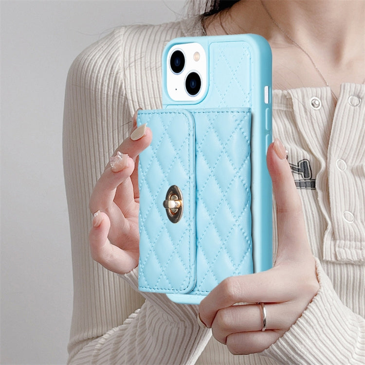 Caja de teléfono de cuero Rómbica para iPhone 14 billetera con hebilla de metal vertical (Azul)