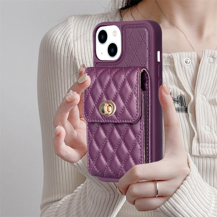 Caja de Teléfono de Cuero Rómbica Billetera con Hebilla Metal Vertical para iPhone 13 (Púrpura Oscuro)