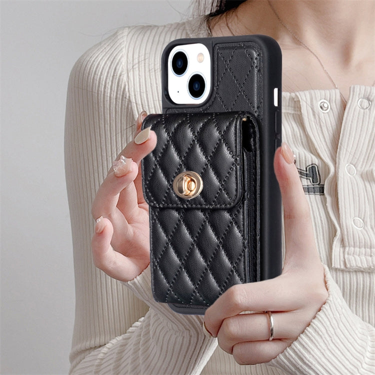 Caja de Teléfono de Cuero Rómbica para iPhone 13 Billetera con Hebilla de Metal Vertical (Negro)