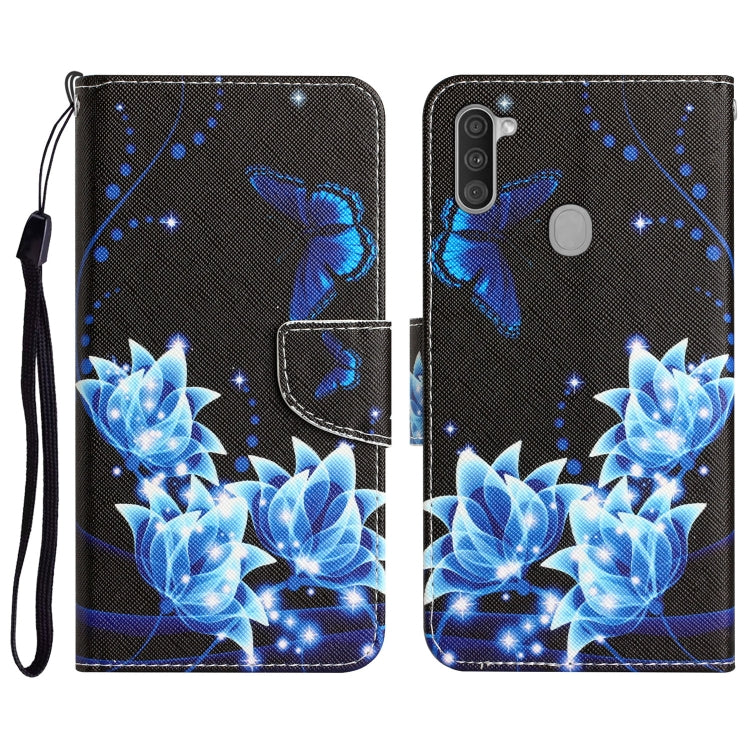 Para Samsung Galaxy A11 Estuche para teléfono de cuero con dibujo coloreado (mariposa azul)