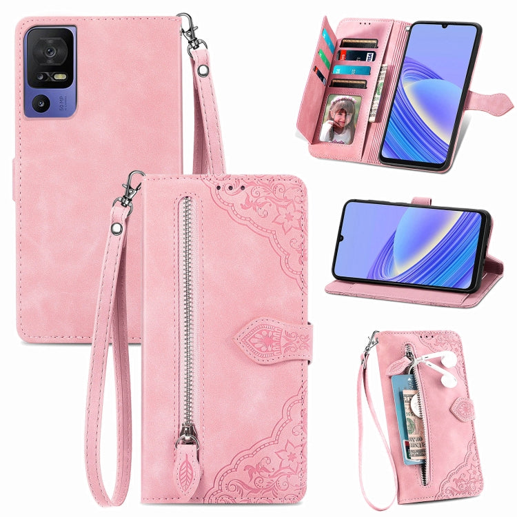 Estuche para TCL 40 SE de Cuero con Cremallera y Flores en Relieve (Rosa)