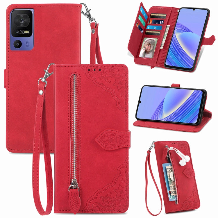 Estuche para TCL 40 SE de Cuero con Cremallera y Flores en Relieve (Rojo)