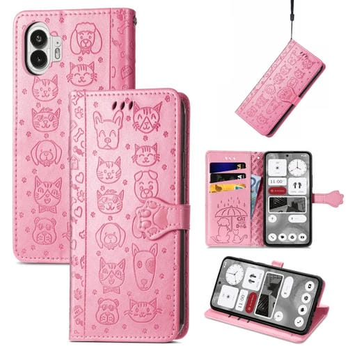Estuche para Nothing Phone 2 de Cuero con Relieve de Gato y Perro (Rosa)