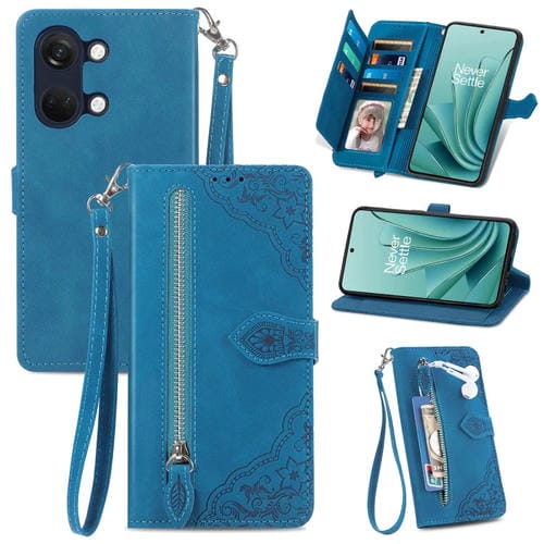 Estuche para OnePlus Ace 2V de Cuero con Cremallera y Flores en Relieve (Azul)