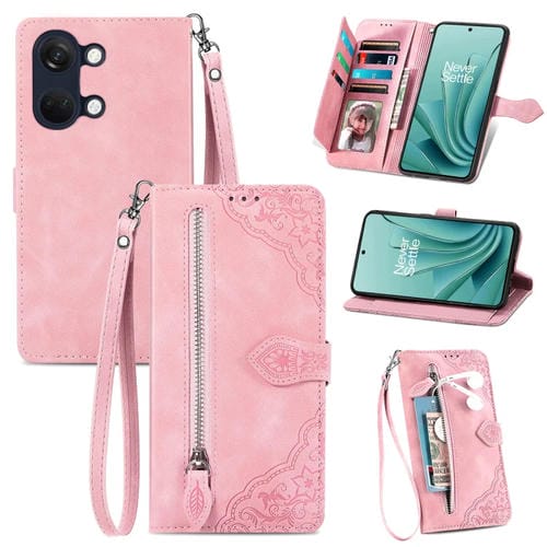 Estuche para OnePlus Ace 2V de Cuero con Cremallera y Flores en Relieve (Rosa)