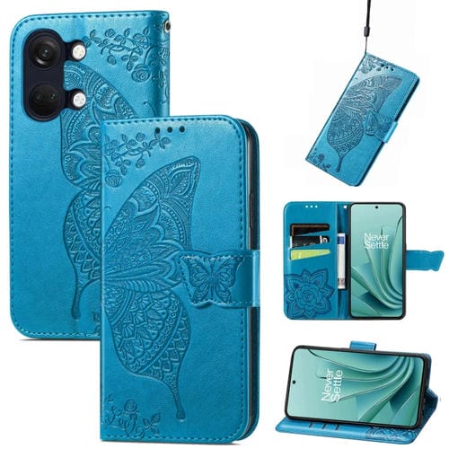 Estuche para OnePlus Ace 2V Butterfly Love Flower de Cuero en Relieve (Azul)