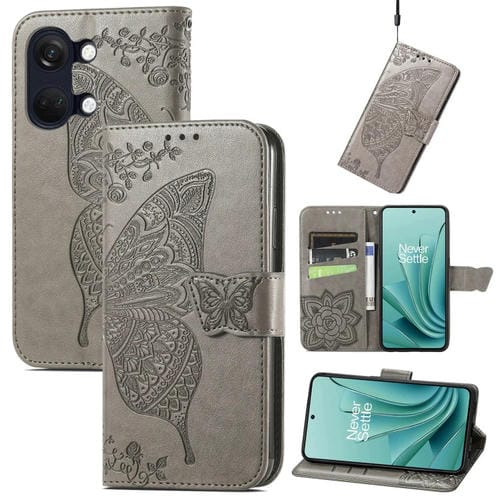 Estuche para OnePlus Ace 2V Butterfly Love Flower de Cuero en Relieve (Gris)