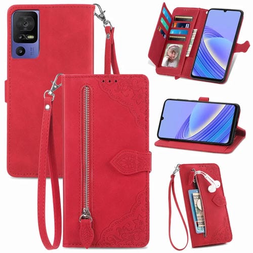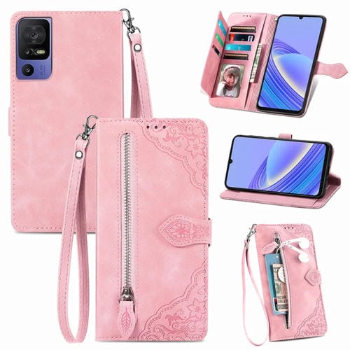 Estuche para TCL 40 SE de Cuero con Cremallera y Flores en Relieve (Marrón)