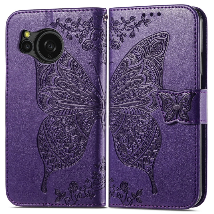 Funda para Sharp Aquos Sense8 de Cuero con Relieve de Flor y Mariposa (Púrpura)
