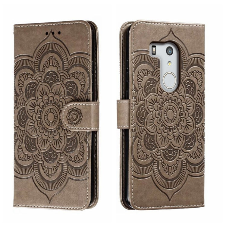 Funda de Cuero para Rakuten Hand 5G con Patrón en Relieve Sun Mandala (Gris)
