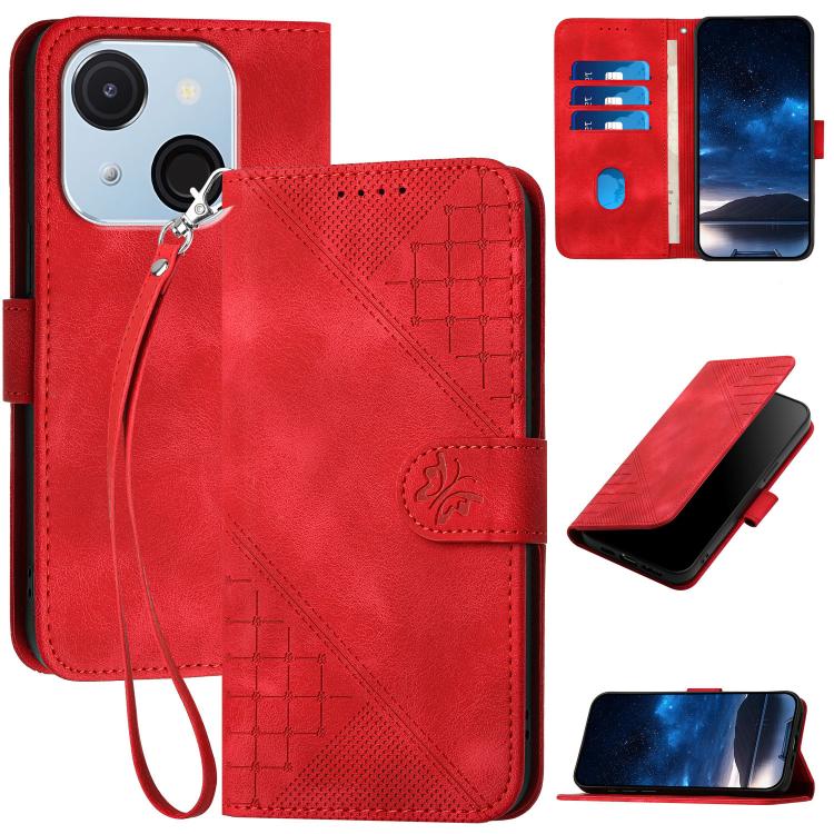 Funda de Cuero Itel A50 con Diseño Mariposa En Relieve y Cuadrícula con Cordón (Rojo)
