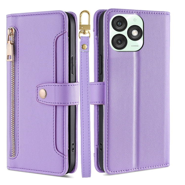 Funda de Cuero Tipo Billetera para Itel A50 4G con Cremallera y Diseño Cruzado (Morado)