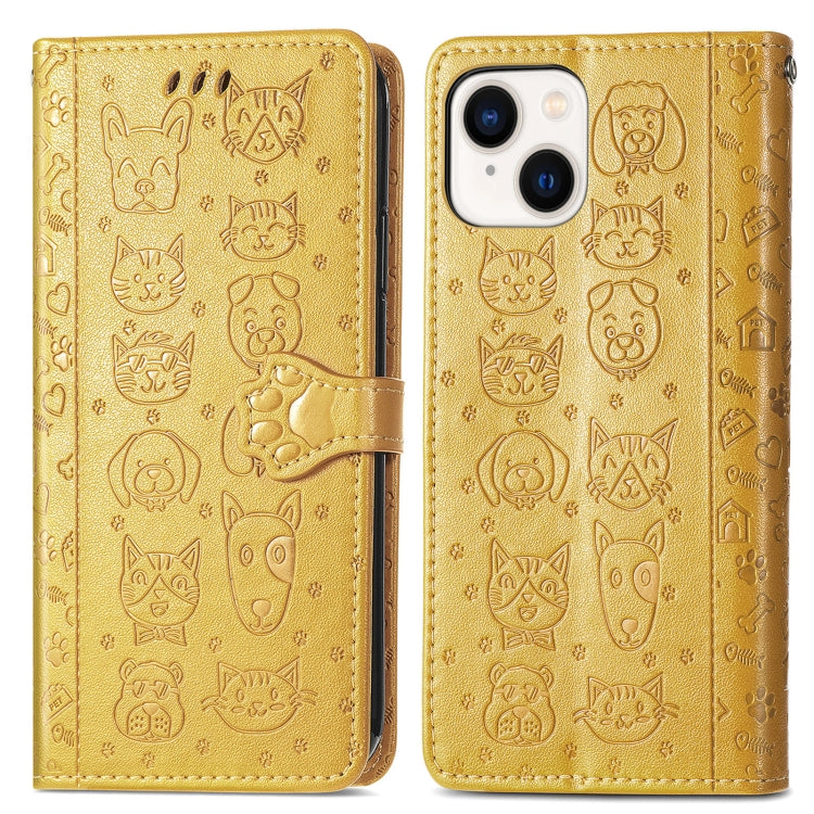 Funda para Teléfono iPhone 15 Plus Cuero Relieve Perro y Gato (Amarillo)