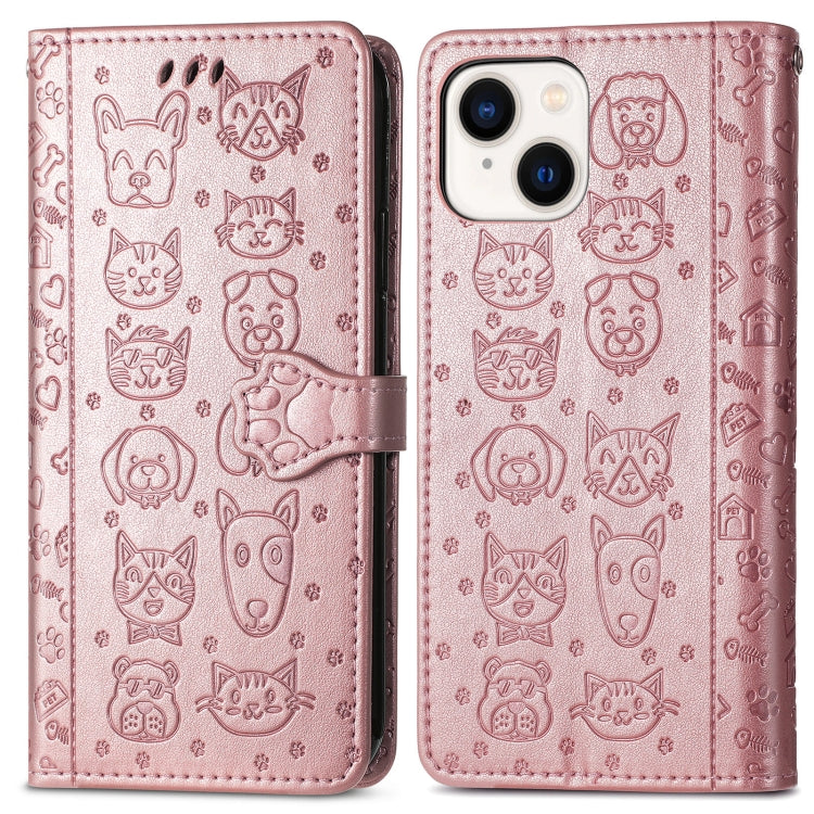 Funda para Teléfono iPhone 15 Plus Cuero con Relieve de Perro y Gato (Oro Rosa)