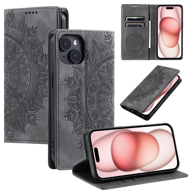 Estuche para teléfono iPhone 15 Plus Cuero Magnético con Relieve de Tótem (Gris)