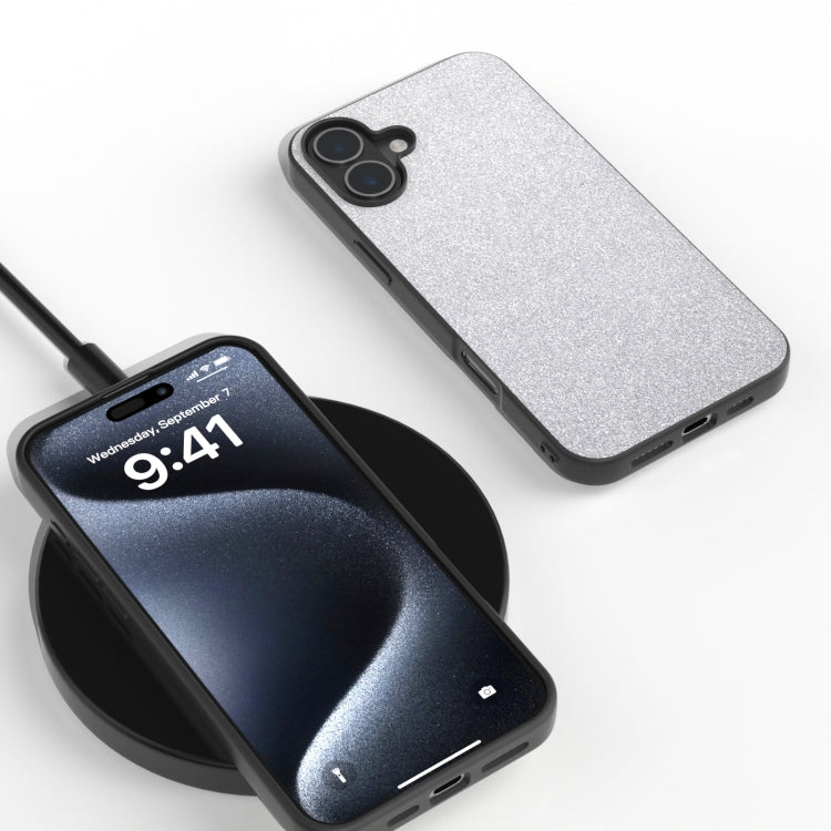 Funda para iPhone 16 Plus Marco Negro Purpurina a Prueba de Golpes (Plateada)