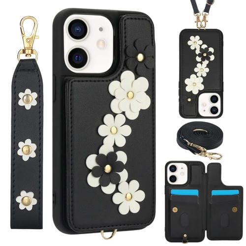 Funda de Cuero para Teléfono iPhone 11 Estampado de Flores Cruzadas (Negro)