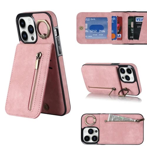 Funda para iPhone 13 Pro Retro Ring y Zipper con Ranura RFID para Tarjetas (Rosa)